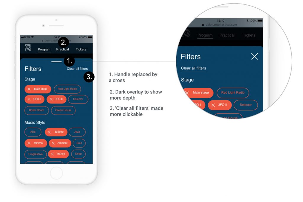 On the program page, I reintroduced horizontal scrolling for the timetable. I understood during interviews with users that this makes it easier to see which artists are playing at the same time. As there are quite a lot of artists and stages, a filter can help the user to refine his search.