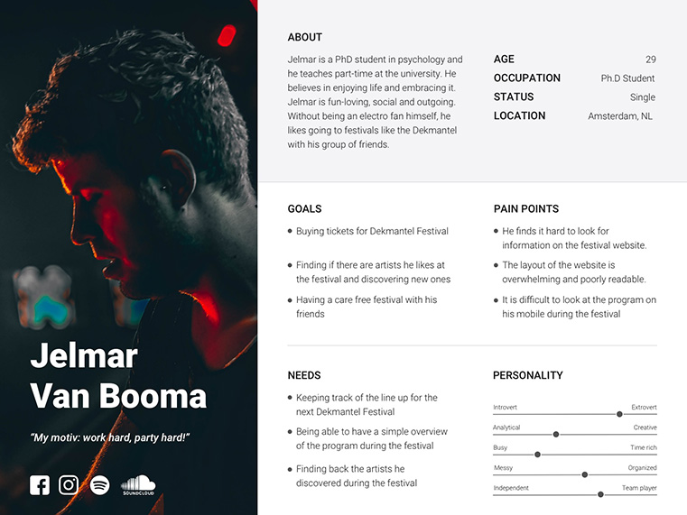 According to my research, my user character is more likely a 20-30 year old who likes to go to summer festivals. I choose to focus on undecided festival-goers, who love electronic music, without being aficionados themselves. They would most likely go there to have a good time with their friends.