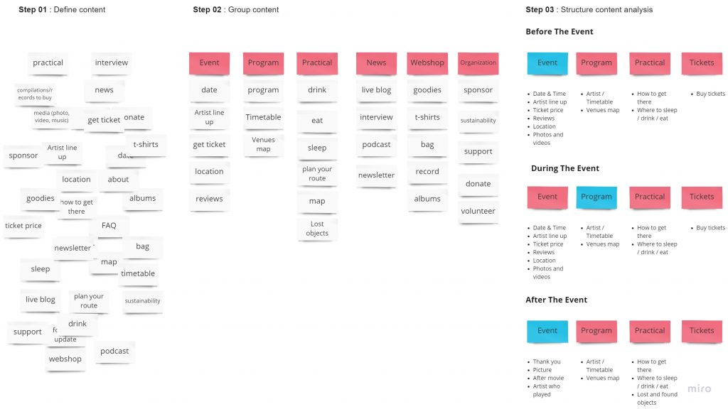 This gives me very useful information about the information architecture of the website during the three stages of the event. I took this research further with a live card sorting with different users.