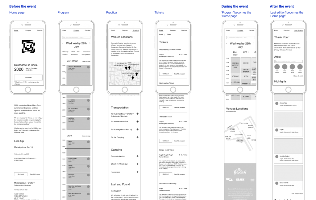 The Dekmantel is a five-day electronic music festival taking place in Amsterdam. The festival has two main locations in the city: Amsterdamse Bos (The Amsterdam Forest) and Aan ‘t Ij (around the Ij river in the city center). Every summer, the festival delights electro fans who come to see world-renowned Dj’s, as well as a huge list of rising names. In recent years, the festival is trying to reach a wider audience by celebrating the richness of Electronic music from electro, acid, techno, trance to jazz music. The Dekmantel expanded to five days and host next to its Dj performances conferences and talks. The objective of this microsite is to create a compelling experience before, during and after the event, to engage the customers and attract new ones.