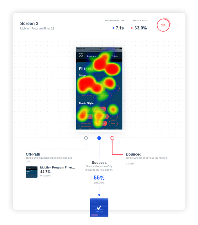 Because of a very limited time frame, I used Maze to do remote user testing. In order to target my audience, I have distributed my prototype through the Facebook group of the festival and some other electro-music groups. In total 51 people tested my prototype.