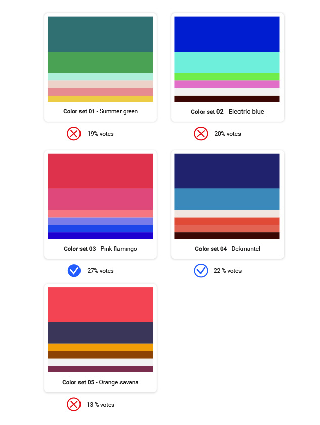 In my survey, I have asked the participant to vote between different color sets and mood boards. The colors were presented first to the interviewees and the mood boards afterward.