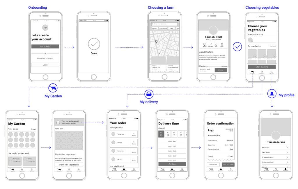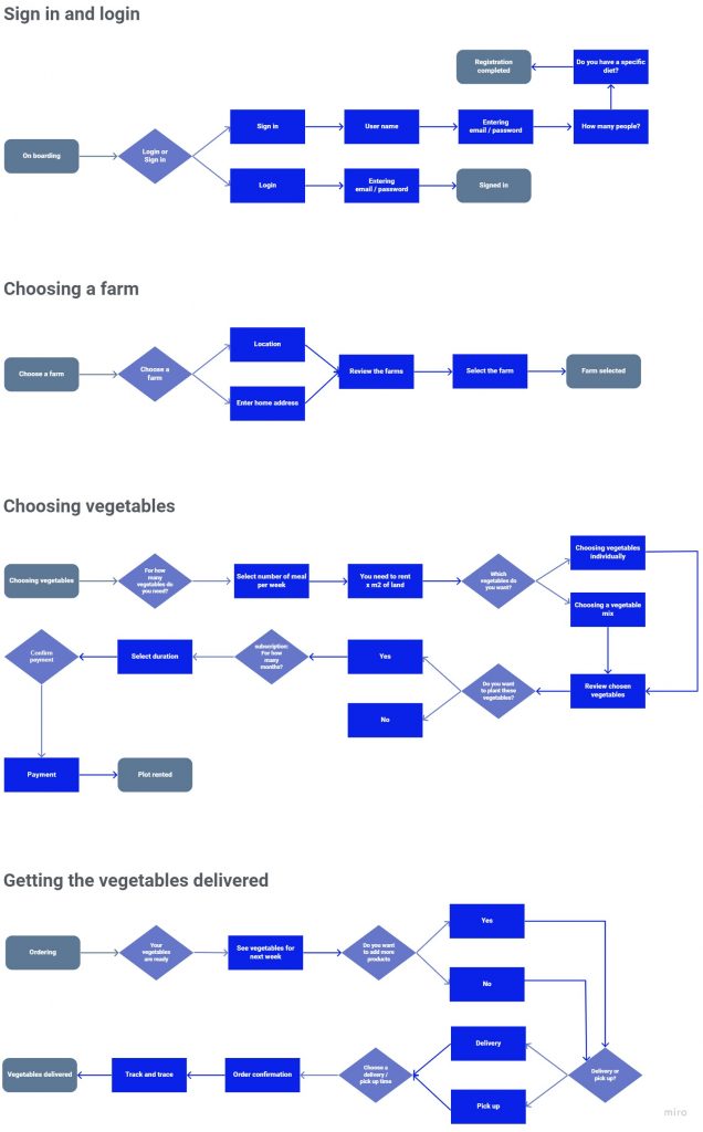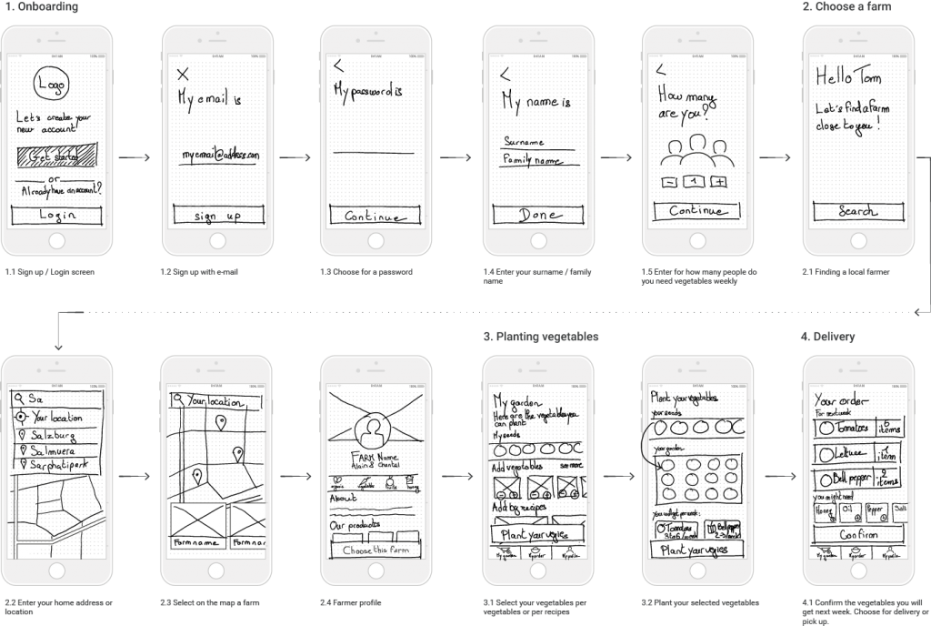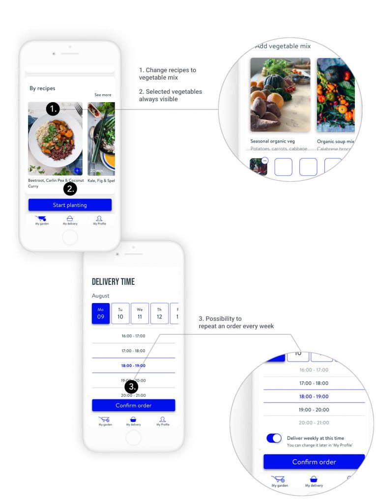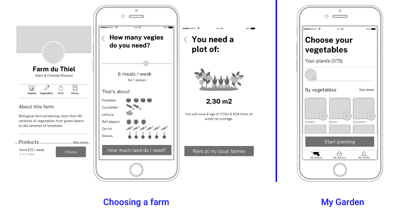 At this stage, I visualized the happy flow of this app ‘selecting vegetable and getting them delivered’. I sketched various solutions and ran user tests. It came up that visualizing the plot where the vegetables will be ‘virtually’ planted (screen 3.2), helped the consumer to understand that the number of vegetables might vary from a week to another.