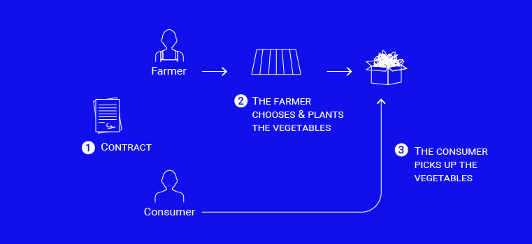 The principle is simple: A group of consumer signs an agreement (1) with a farmer, who will produce for them vegetables for a whole season (2). Every week, the consumers will pick up a bag of vegetables (3).