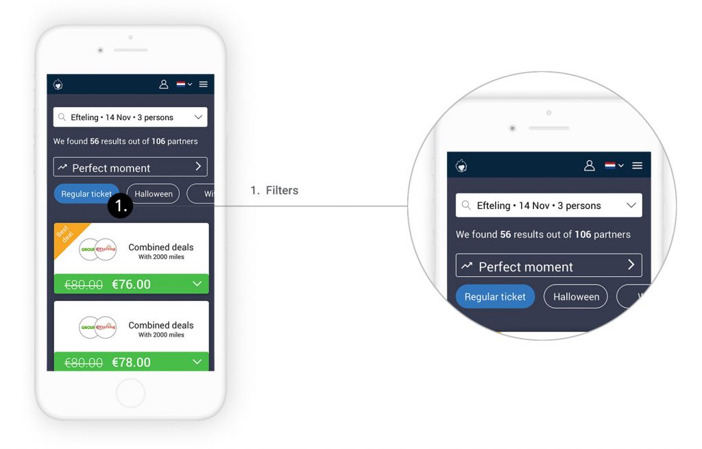 At first, our client wanted to add more fields for the user to specify what ‘type’ of tickets he would like. For example, for a spa, you can have a ‘day ticket’ an ‘evening ticket’ or even a ‘ticket with stay’. Instead of adding more fields to fill in in the previous step, we proposed to add filter in the search results. By doing so, the user can also compare different tickets without having to start his search over again.