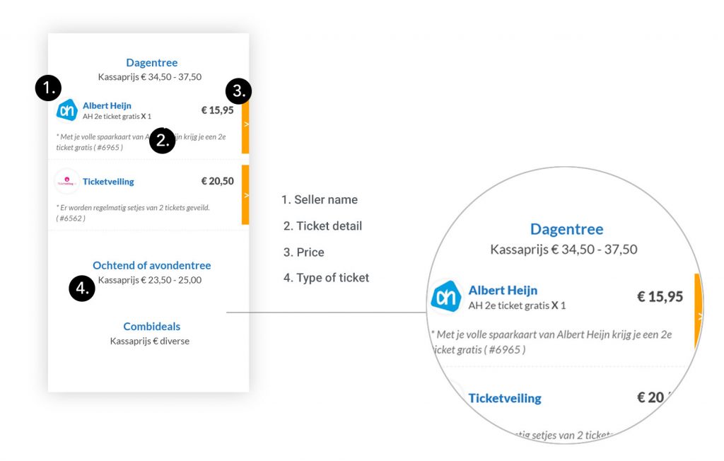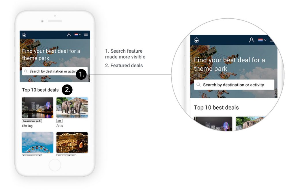 The search feature is the first thing the user will see on the homepage, together with a short text explaining the purpose of the website: ‘Find the best deals for amusement park and zoo tickets’’. This makes it easy to understand and use. Below, will be presented by card the ‘10 best deals, the most searched parks, etc…