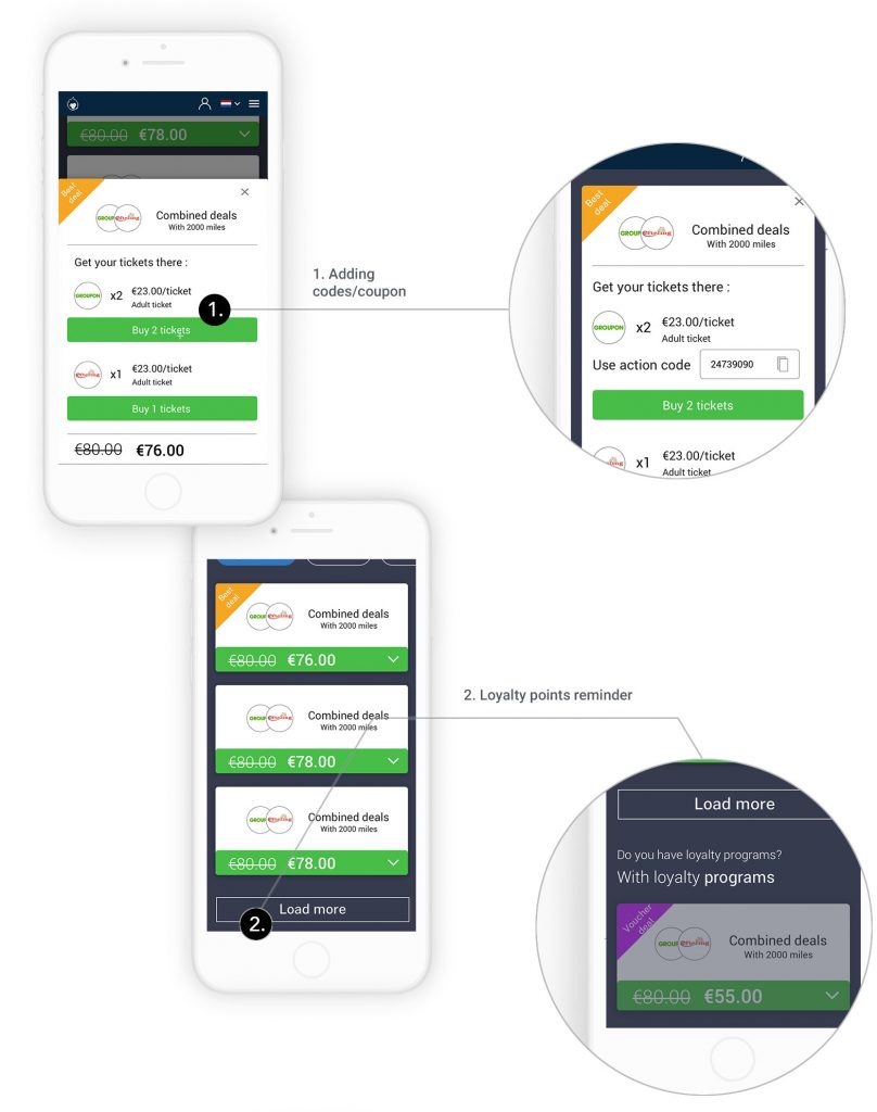 We added price suggestions on the calendar to show to the user which day of the month is the cheapest. We designed further the comparator results, and in particular the deal detail explaining to the user how to get his deal on the partner’s websites. As requested by our client, we added a card on the result page explaining to the user that he can still get a better deal if he has vouchers.