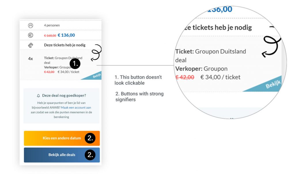 On the result page, the user is invited to go to a partner website to get his ‘best deal’. However, this link to ‘get the best deal’ doesn’t look like a button. The user will more likely scroll down and click on one of the other buttons ‘choose another date’ or ‘look at all deals’. These buttons have indeed strong signifiers.